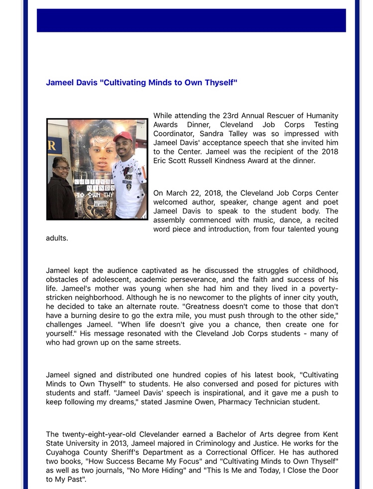 0 comments on “Cleveland Job Corps Building Futures Today March 2018 Newsletter Features, Author, Speaker, Change Agent and Poet, Jameel Davis.”